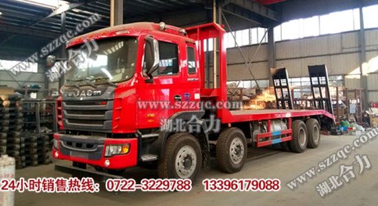 其改装部分采用板材厚度:8mm花纹板,爬梯:120mm套100mm槽钢,横梁:100mm国标方钢,平板离地面高度850mm—900mm。货台长8米,宽2.5米,是运输挖掘机,推土机的最理想车型.货台离地面只有0.85米.适合各种路况的运输车。